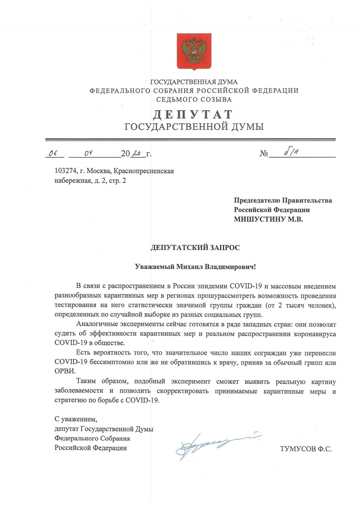 В связи с этим депутат обратился к Правительству Российской Федерации с предложением провести популяционное исследование на широкой выборке. Взять от 2 тысяч добровольцев из разных социальных групп и протестировать их на коронавирус. Существует вероятность, предположил Федот Тумусов, что у значительной части этих добровольцев будут найдены антитела к вирусу, а значит, они уже перенесли болезнь (возможно, бессимптомно).