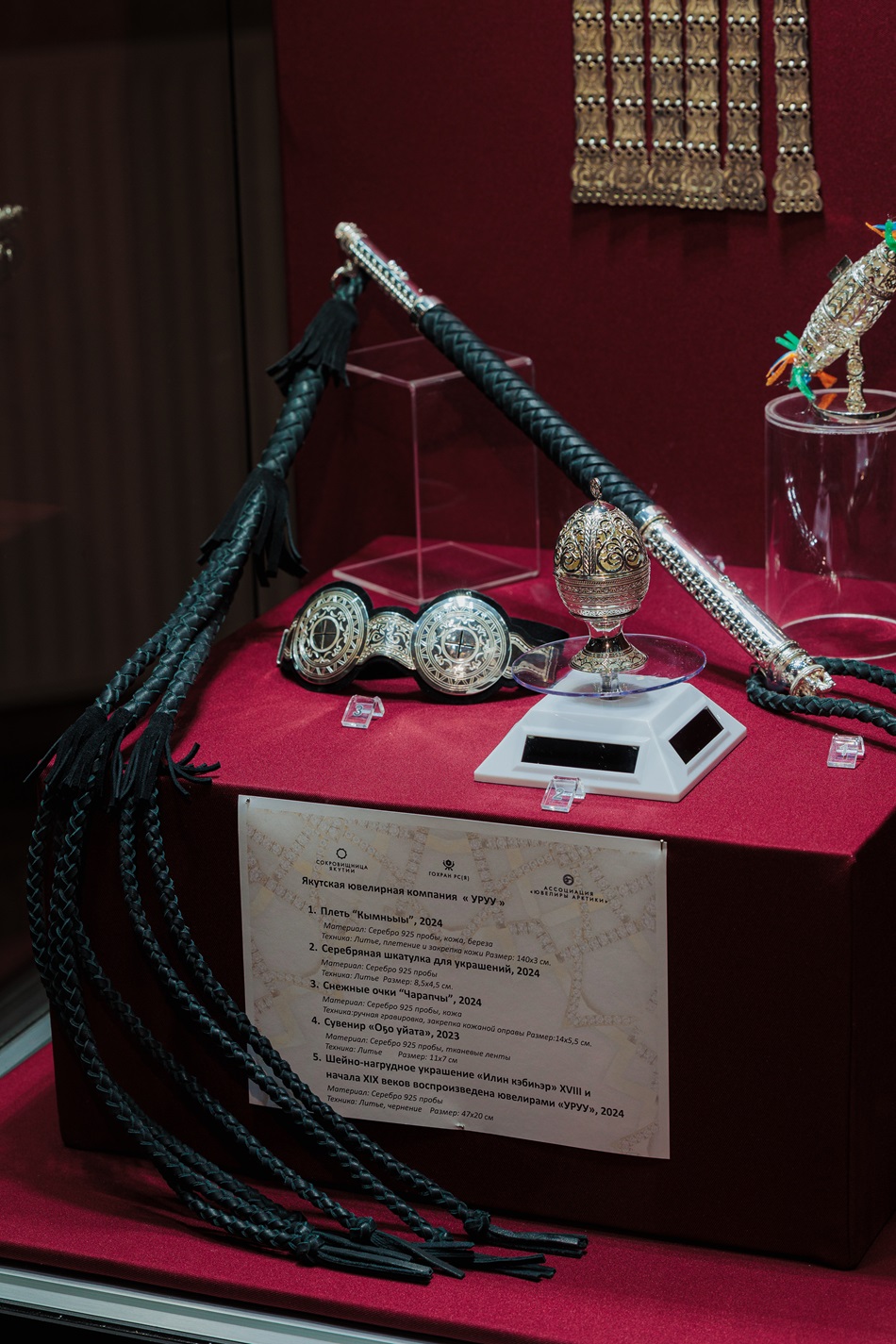 Ювелирная компания УРУУ на выставке представила 5 ювелирных изделий: это талисман "Оҕо уйата", снежные очки "Чарапчы", плеть "Кымньыы" с серебряной рукояткой, шейно-нагрудное женское украшение, выполненное ювелирами УРУУ на основе музейного экспоната и серебряная шкатулка. Каждое изделие хранит в себе традиции якутского народа, отражает семейные ценности и культурное наследие, передаваемое из поколения в поколение. Сочетая в себе якутскую традицию и современный дизайн, УРУУ стремится удовлетворить потребности самых взыскательных клиентов, предлагая несравненное качество и неповторимый стиль, который словно заставляет сердца звучать в унисон с якутской природой.