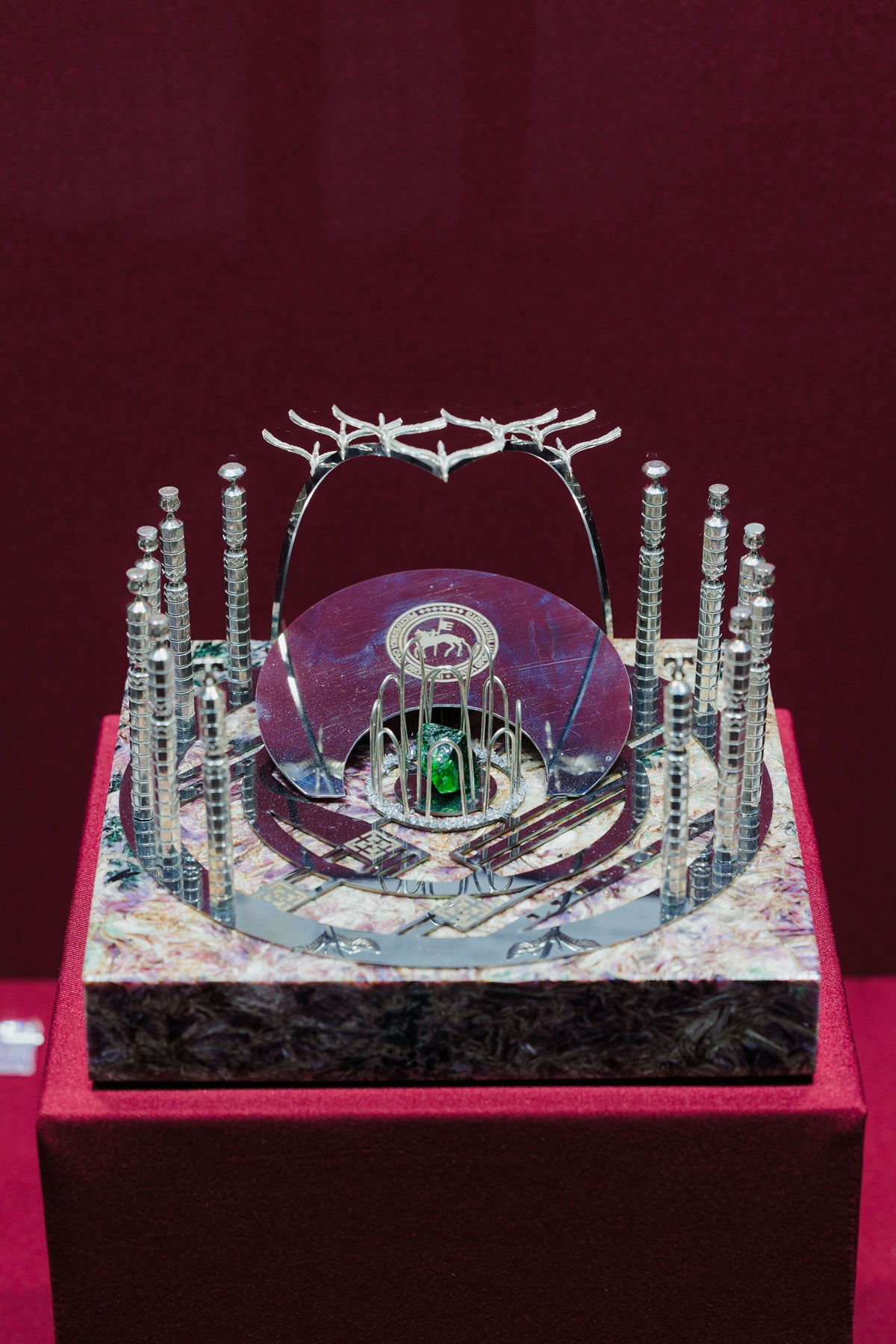 Особая гордость в этом году — сувенир «Площадь Республики». Это изделие из серебра, инкрустированное бриллиантами, хромдиопсидами и чароитом, посвященное главной площади Якутии.