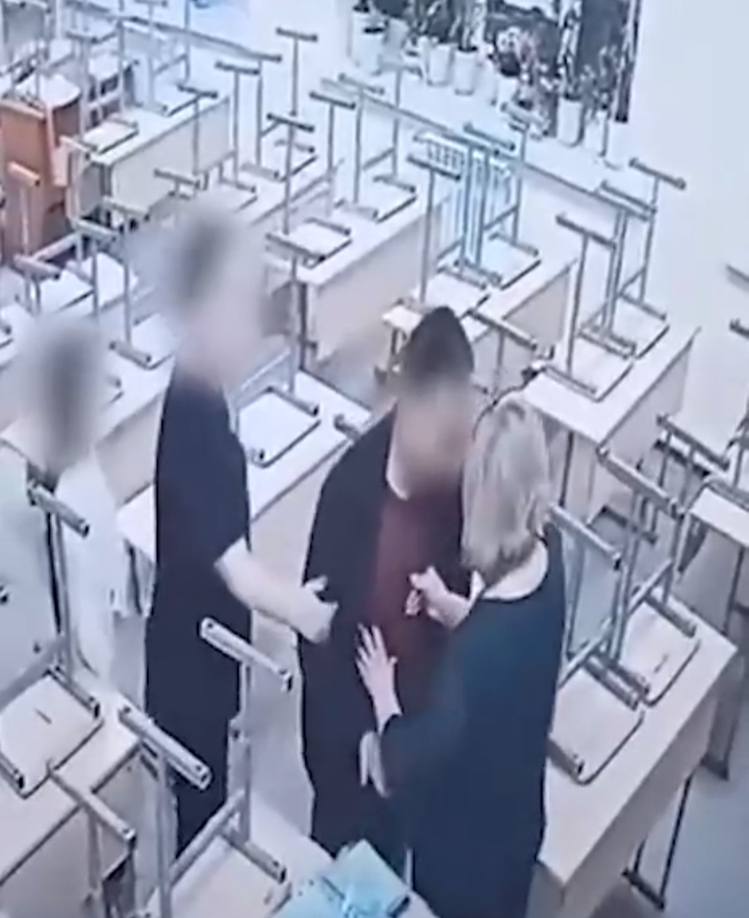 На записи видеокамеры видно, что проходя между узким проходом между партами, он задевает плечом учительницу и не отходит от нее. Тогда женщина выставляет руки вперед, чтобы отстранить от себя мужчину. Но Василий направляется в ее сторону и толкает. Жена Василия сначала пытается отдернуть мужа, а затем уводит из-под камеры дочь.