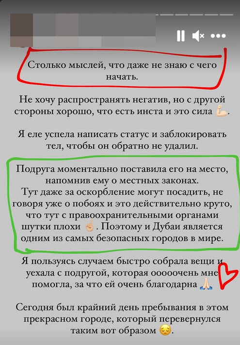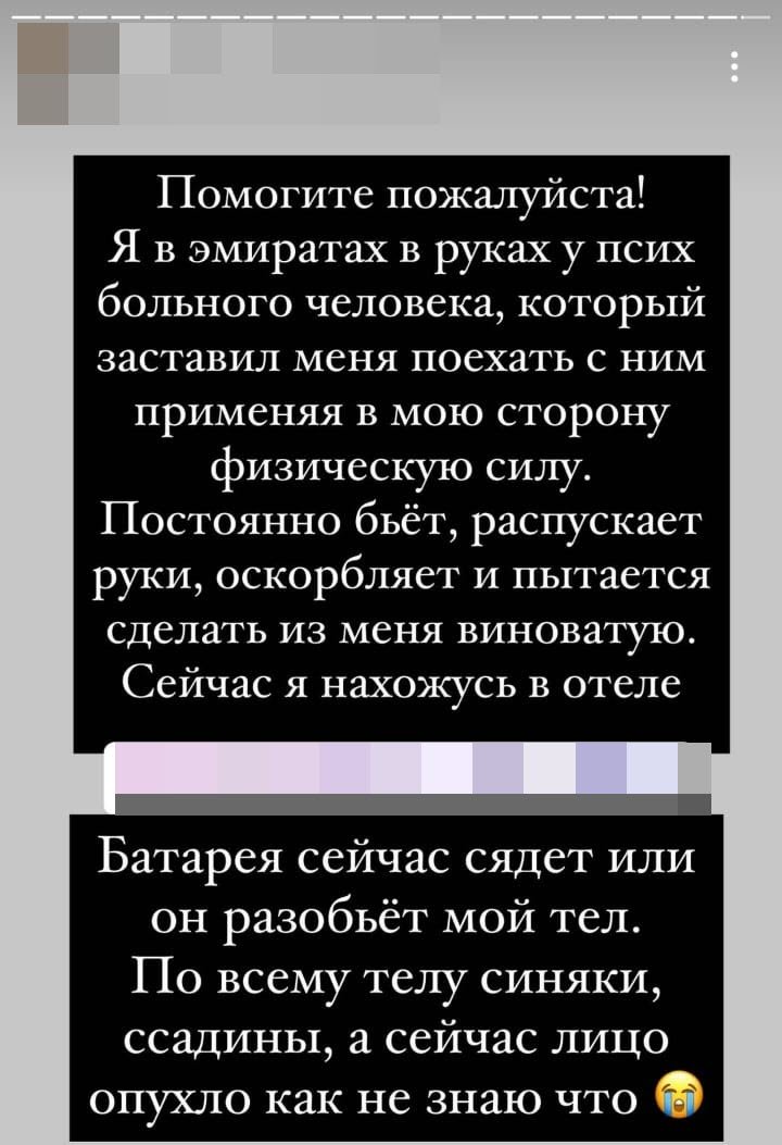 "Помогите пожалуйста. Я в Эмиратах у психически больного человека, который заставил меня поехать с ним, применяя физическую силу. Постоянно бьет, распускает руки, оскорбляет. Сейчас я нахожусь в отеле. Он может разбить мой телефон. По всему телу синяки, ссадины, и лицо опухло", - обратилась она к читателям.