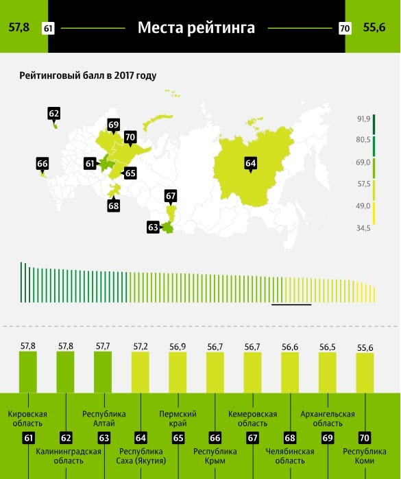 Последние места в рейтинге занимают Еврейская автономная область, Камчатский край, Магаданская область, Забайкальский край, Амурская область, Бурятия, Чукотка, Хакасия, Приморье и Ненецкий АО. При этом Хакасии, которая в предыдущем рейтинге находилась в аутсайдерской пятёрке, удалось улучшить свои позиции и подняться на несколько строчек вверх.