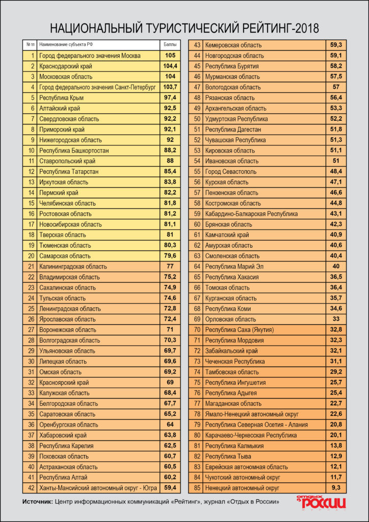 Центр информационных коммуникаций «Рейтинг» и журнал «Отдых в России» провели четвертое ежегодное исследование, посвященное развитию внутреннего и въездного туризма, туристической привлекательности российских регионов, их туристическому потенциалу и популярности среди отечественных и иностранных туристов.