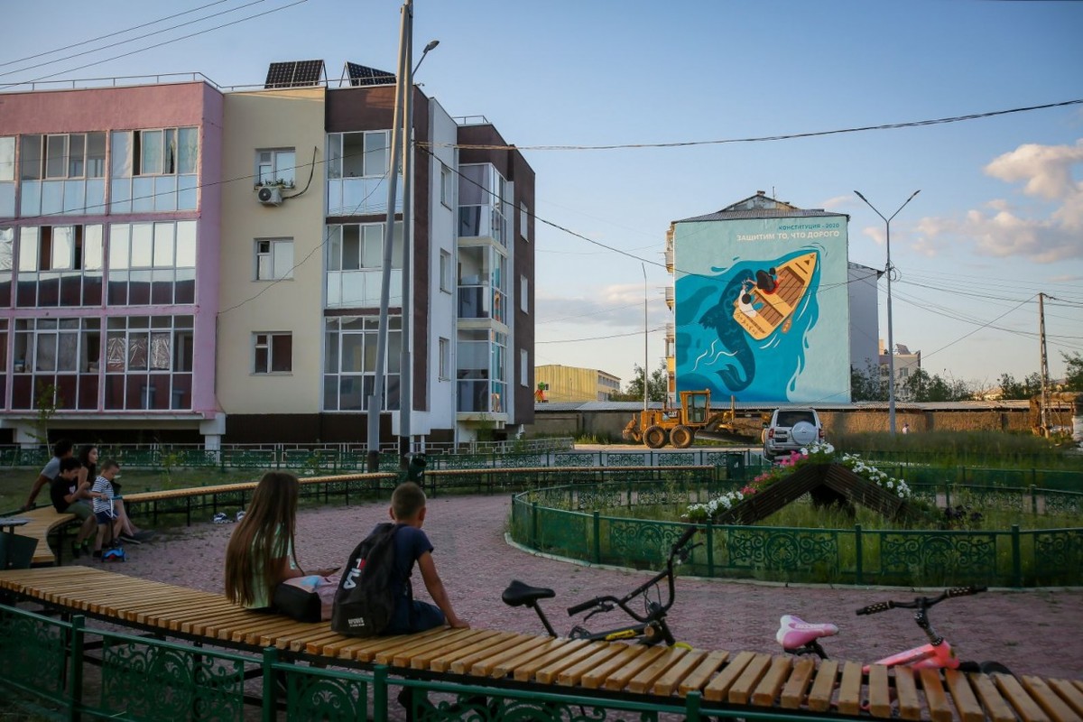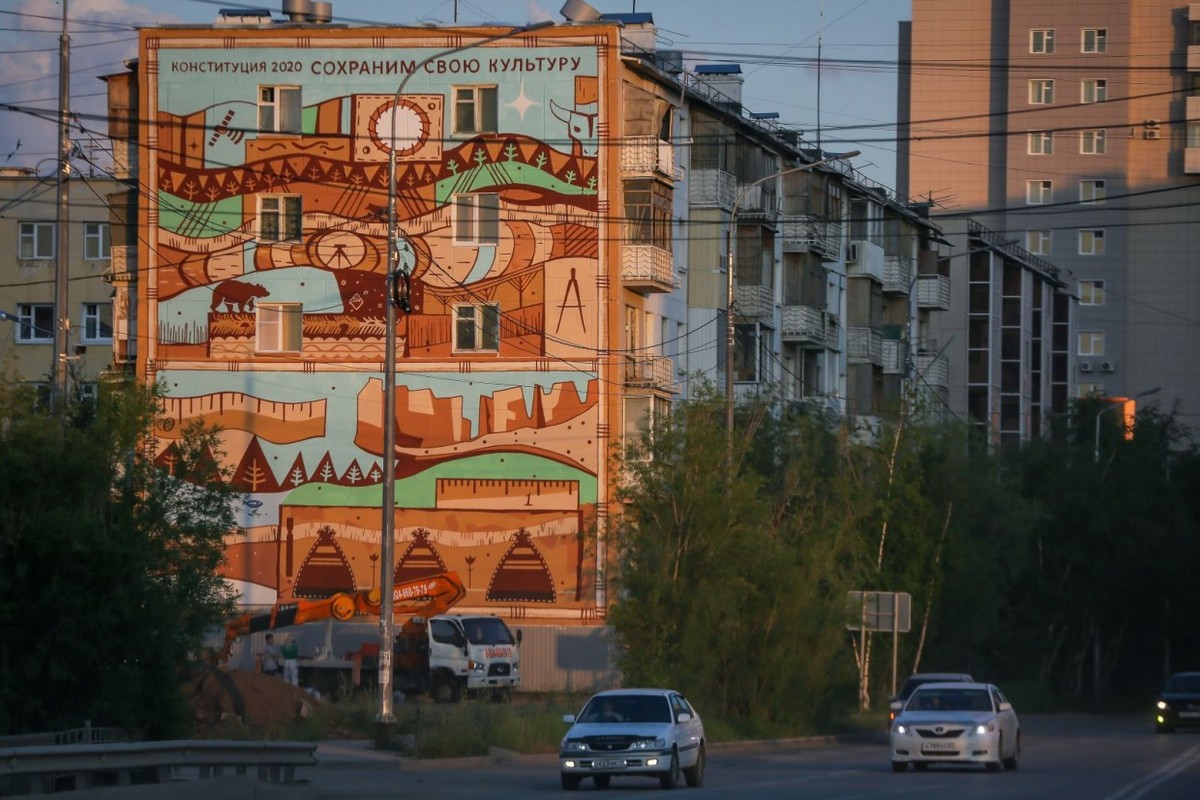 Большие красочные полотна появились на торцах двух жилых домов в Якутске и в поселке Жатае. Авторы работ – якутские художники Николай Григорьев и Софья Шилова, которым в рамках совместного проекта с Центром компетенций по вопросам городской среды РС (Я) было предложено создать муралы по мотивам, пересекающимся с темами поправок в Конституцию РФ.