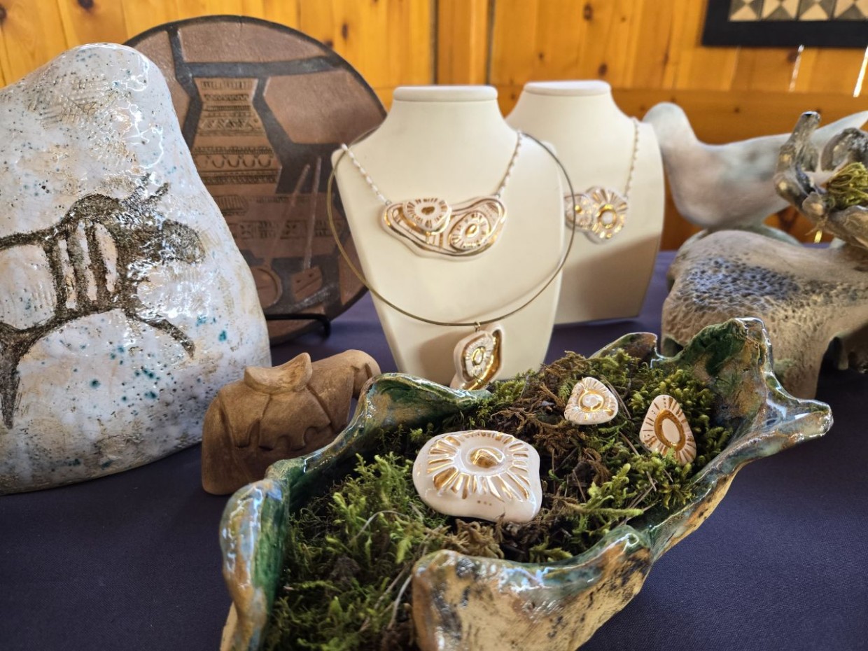 Все изделия, представленные на выставке, участвуют в конкурсе по трем направлениям: традиционная керамика, современные керамика и «Юный керамист». Среди современной керамики отдельного внимания заслуживает позолоченный набор украшений с колье-обручем.