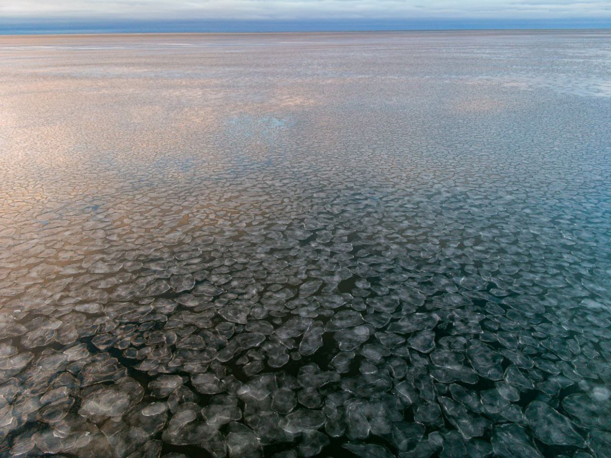 На финальном этапе ветер и ледяная вода шлифуют льдины, придавая им круглую блиноподобную форму. И, если такие лепешки находятся на поверхности воды - то они начинают плавать, крутясь как волчки.