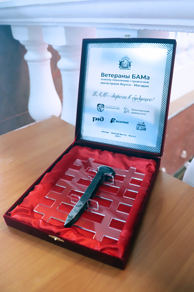 Этот важный символический подарок московские школьники передали Алексею Местникову от имени ветеранов БАМа с напутствием молодому поколению и пожеланием использовать его для зашивки «серебряного звена» железной дороги Якутск – Магадан, символизирующего начало строительства железнодорожной линии Якутск – Магадан.