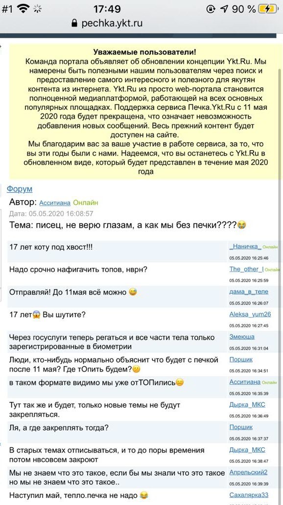 «Команда портала объявляет об обновлении концепции Ykt.Ru. Ykt.Ru из просто web-портала становится полноценной медиаплатформой, работающей на всех основных популярных площадках. Поддержка сервиса Печка.Ykt.Ru с 11 мая 2020 года будет прекращена, что означает невозможность добавления новых сообщений. Весь прежний контент будет доступен на сайте.