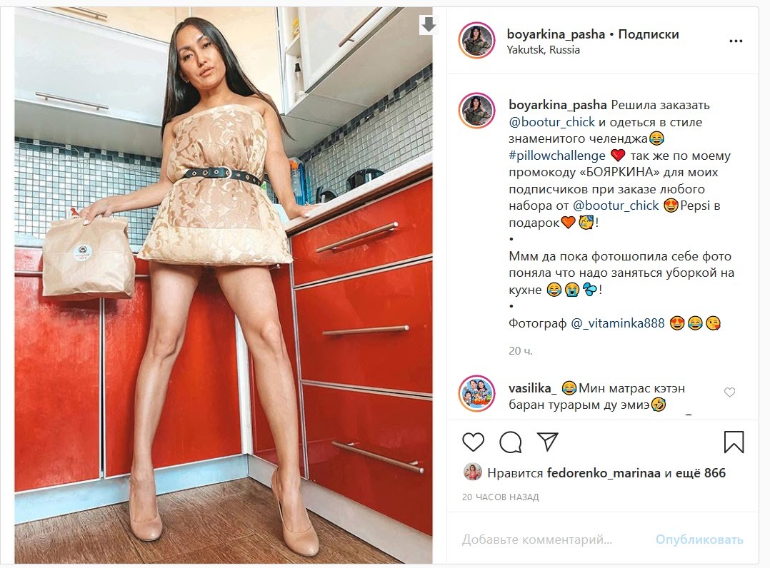 Напомним, что в Сети набирает популярность #pillowchallenge - платья из подушки, которую участницы перехватывают ремнем. Таким образом подушка превращается в коктейльное платье, которое дополняется украшениями и высокими каблуками. Так девушки выглядят гламурно, и при этом не нарушают режим самоизоляции.
