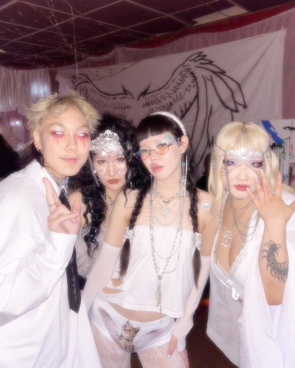 Но наше внимание тут приковали не диджеи, а юноша и девушки в белом. Они называют себя ангелами, соответственно, носят белые наряды и причудливые украшения, вдохновленные якутскими мотивами. В общем, пугающе красивые, неземные создания.