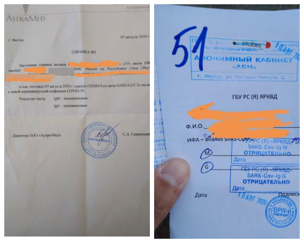 «Через три дня сдал ИФА на антитела к ковид в ГБУ РС(Я) ЯРКВД, молился, чтоб lgG был высоким. И вот результат - антитела вообще не обнаружены. Кроме того, если бы обнаружились, там было бы прописано количество этих антител. Также я сдал ПЦР в поликлинике №3. Все отрицательные. Итого, я заплатил за анализы 5443 рубля за все, плюс такси. Супруга сдавала анализы в Медцентре Якутска.