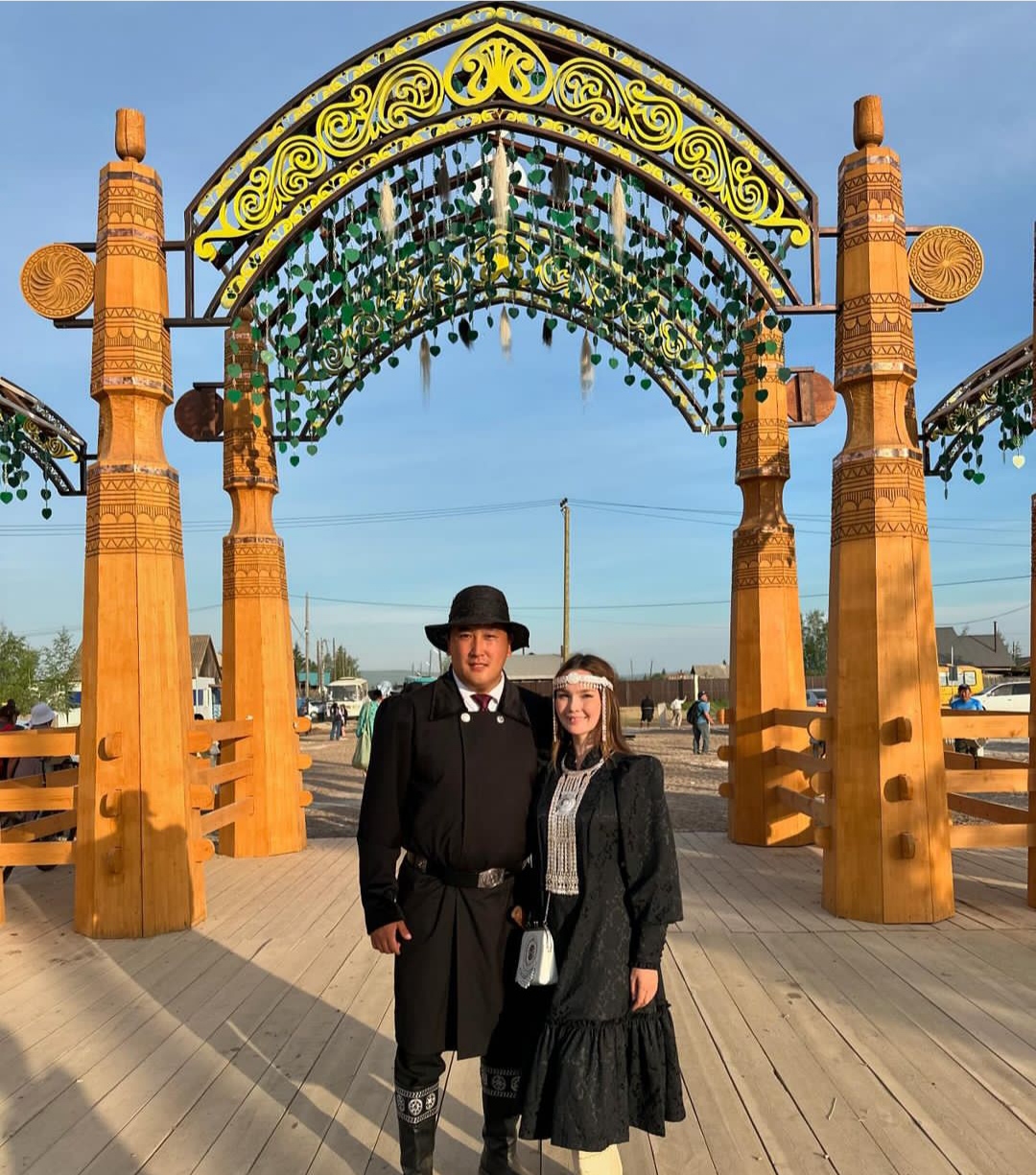 Ысыах Олонхо также посетила блогер Сардаана Охлопкова вместе с мужем Прокопием Румянцевым, главой села Борогонцы Усть-Алданского улуса. Супруги были одеты во все черное, для них это скорее всего был деловой визит. Вообще мы заметили, что первые леди наслегов выбирают темную палитру под цвет мужниного камзола.