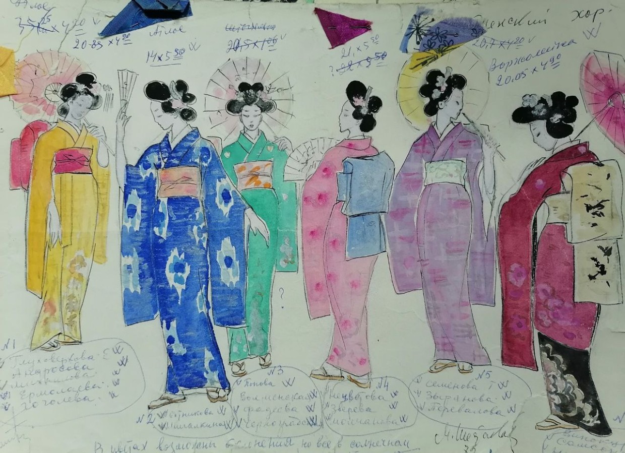 Мария Ефимовна создала для спектакля сценографию, тонко и поэтично передающую дух Страны восходящего солнца, притом ее эскизы не только досконально отражают культуру страны, но и характеры всех персонажей, не только главных.