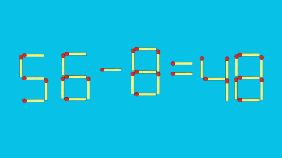 Показываем решение для самых нетерпеливых: мы забираем одну спичку из первой цифры «9» (превращая её в «5») и добавляем её ко второй шестёрке (делая из неё «8»). Смекалка поможет вам собрать: «56 — 8 = 48».