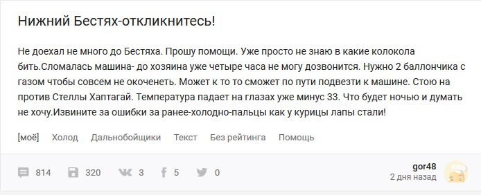 «Не доехал немного до Бестяха. Прошу помощи. Уже просто не знаю в какие колокола бить. Сломалась машина- до хозяина уже четыре часа не могу дозвонится. Нужно два баллончика с газом чтобы совсем не окоченеть. Может кто-то сможет по пути подвезти к машине. Температура падает на глазах: уже минус 33. Что будет ночью и думать не хочу».