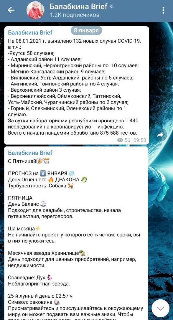 Заместитель председателя правительства Якутии Ольга Балабкина начала постить астрологические прогнозы в своем телеграме сразу после ежедневной информации про COVID-19. Первые посты появились 5 января.