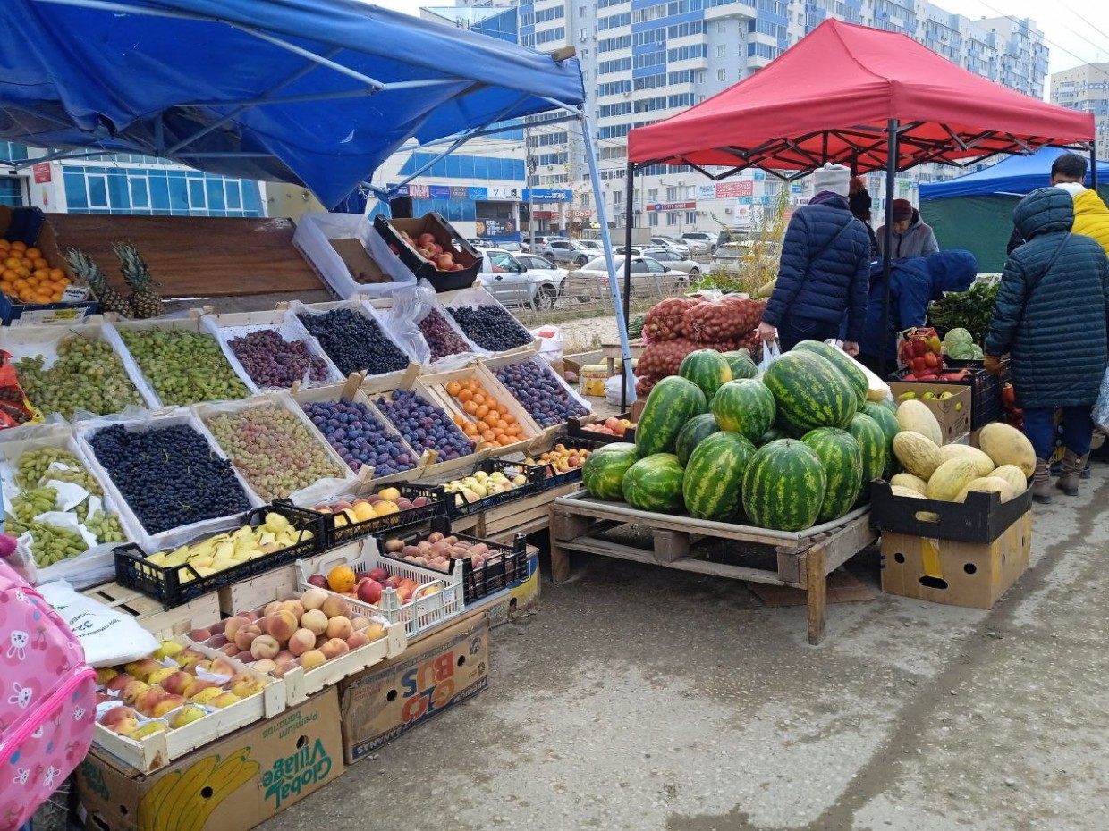 На ярмарке продавались не только овощи, но и фрукты. Скоро снег выпадет, так что надо успевать купить фрукты пока есть. Арбузы продают 50 руб кг, дыни по100 р. "Оптовая цена, Бери пока есть", - сказал продавец.