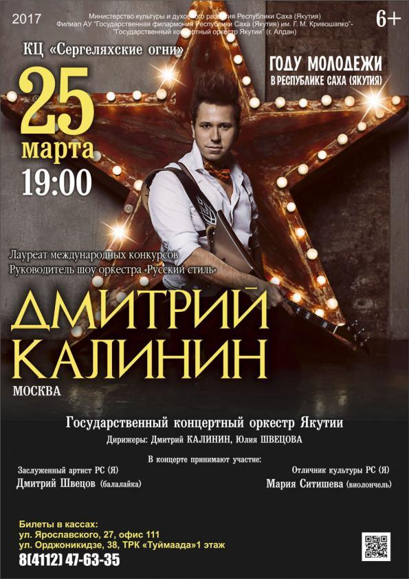 25 марта в 19:00 в КЦ "Сергеляхские огни" в сопровождении Государственного концертного оркестра Якутии выступит лауреат международных конкурсов, руководитель шоу-оркестра "Русский стиль" Дмитрий Калинин (рок-балалайка), Москва.