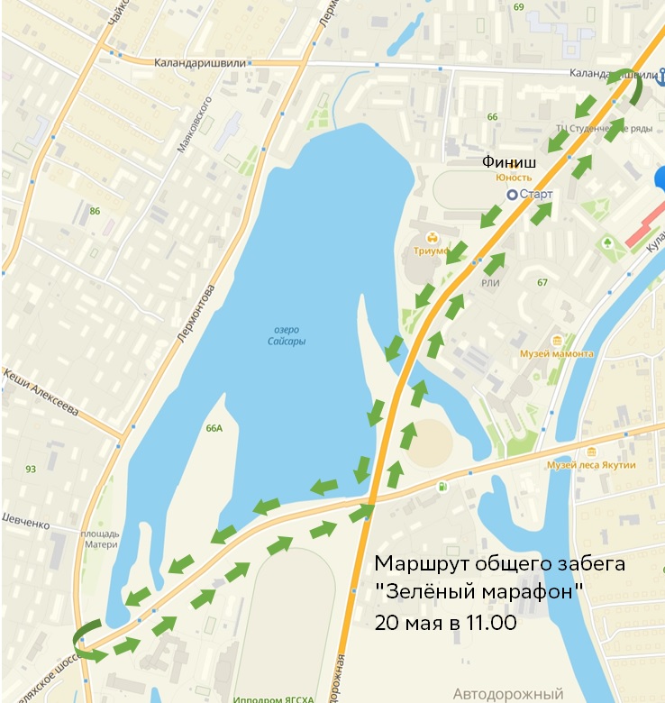 Маршрут: от стадиона «Юность» по улицам Ойунского, Сергеляхское шоссе до перекрестка улиц Красильникова/Лермонтова, с разворотом в обратном направлении до перекрестка улиц Каландаришвили/Ойунского и финишем на стартовой точке – возле стадиона «Юность».