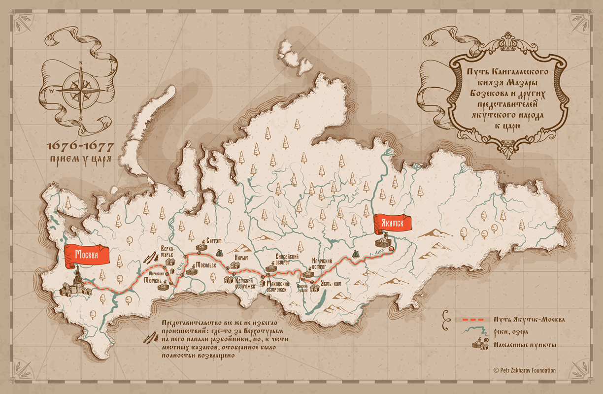 Наглядно представляем Вам проиллюстрированную карту проделанного пути якутского представительства до Москвы в 1676-1677 гг.: