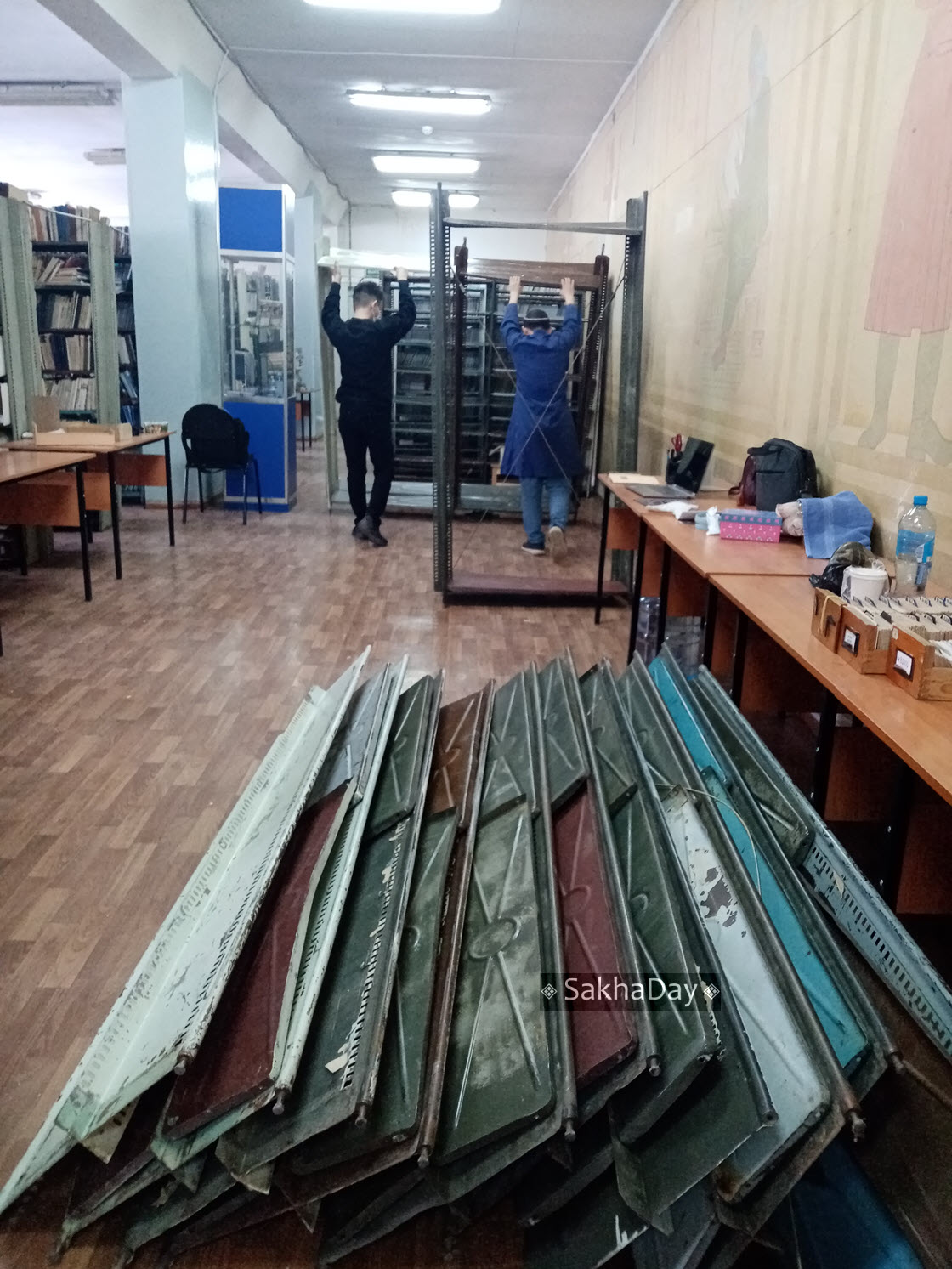 Мужчины занимаются металлическими стеллажами для книг, переносят их с первого этажа – книгохранилища на третий или четвертый (!).