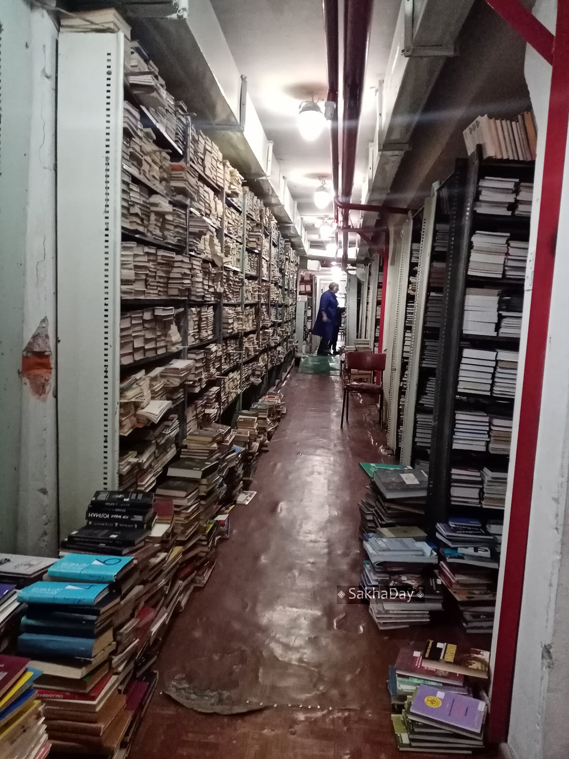 «Система пожаротушения у нас относительно новая. А вот двери и окна, как видите, менялись только частично», - показывает заместитель директора Национальной библиотеки и ведет нас вниз по лестницам и коридорам, куда не ступает нога обычного читателя, посетителя главной библиотеки Якутии.